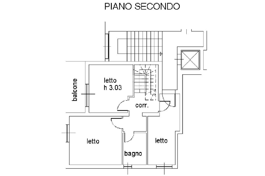 Una scala interna con struttura in cemento armato, gradini rivestiti in parquet e parapetto in vetro antiproiettile su struttura in acciaio, collega al secondo piano, dedicato alla zona notte. Qui si trovano tre camere da letto, un ulteriore bagno finestrato e un terzo balcone.